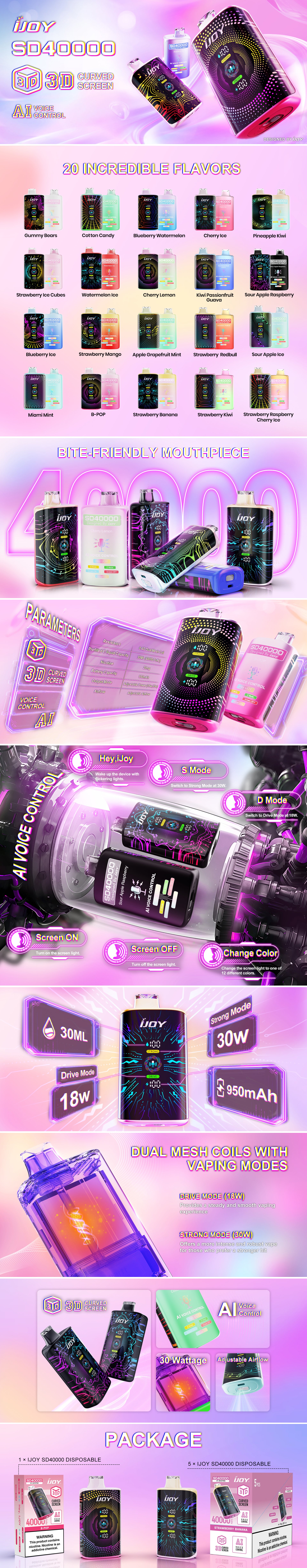 Meet the IJOY SD40000 Disposable, the world's first Al voice-control disposable that brings you an immersive vaping experience. Equipped with the most advanced State-of-the-Art Technology Mega 3D curved screen,12-color ambient lighting available. Easy viewing percentage display of E- Liquid & Battery. Up to 40000 puffs with integrated 750mAh rechargeable battery , Features two power selecting mode: Strong Mode(30w), and Drive Mode(18w) to suit your preferences.